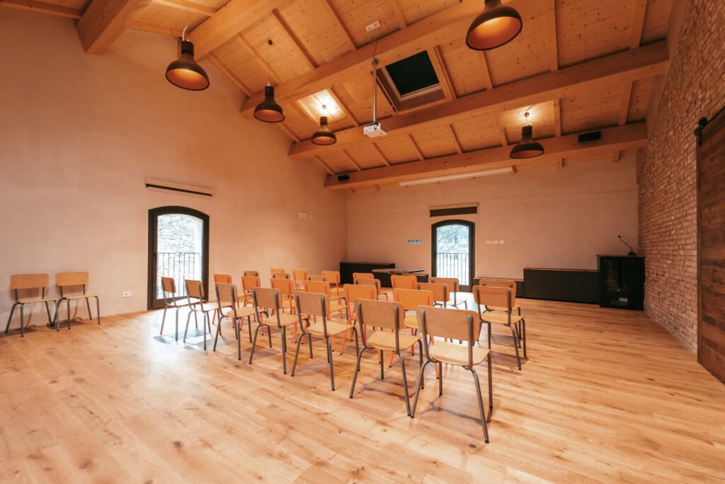 La sala è completamente attrezzata per garantire incontri efficaci e senza pensieri. A disposizione degli ospiti: videoproiettore con superficie di proiezione, impianto audio con microfoni, lavagna per presentazioni, sedute confortevoli e bagno privato dedicato. L’ambiente è inoltre dotato di riscaldamento e climatizzazione, per assicurare il massimo comfort durante tutto l’anno.